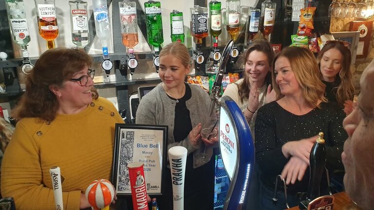 The Blue Bell, Maxey - Rural PotY 2026. Nominator Jackie Fordham presents the award to the team at the Blue Bell